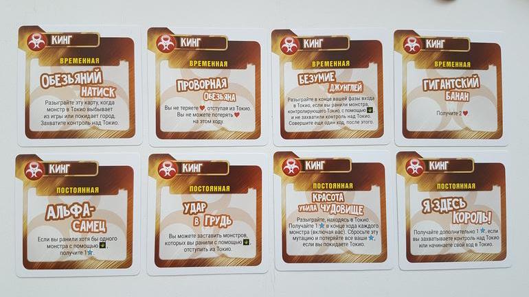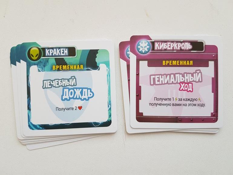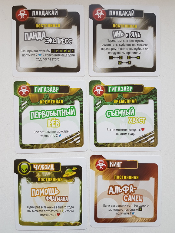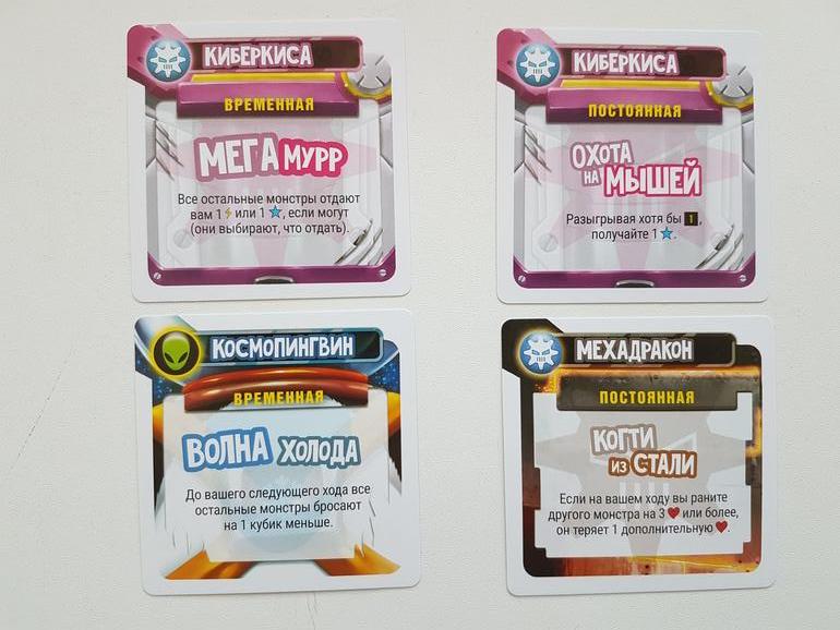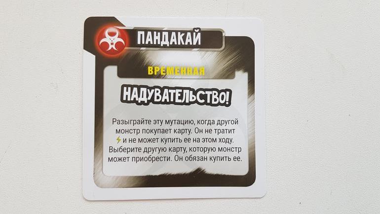 Мутации монстров вносят в игру разнообразие и небольшой элемент неожиданности. Если в базовой игре мы в основном только бросали кубики, лишь изредка приобретая карты, которыми еще не каждый ход можно воспользоваться, то с дополнением можно чуть больше влиять на игру. Мутации у каждого монстра свои, то есть действия соперников будут в любом случае разными. Взятые из своей колоды, но еще не разыгранные карты игроки держат взакрытую и могут разыграть в любой момент. На мой взгляд, некоторые мутации полезнее и интереснее, а некоторые так себе (хотя возможно мы просто не умеем ими пользоваться).