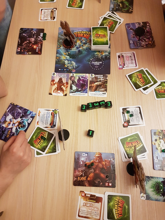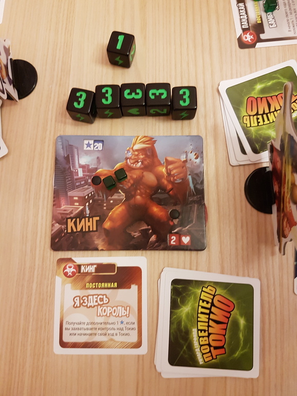 Вообще очень насыщенная партия вышла. У меня была открыта карта мутаций, дающая дополнительное очко за вход в Токио или нахождение там на начало хода (кроме очков, предусмотренных основными правилами). Поэтому я не стала убегать перед началом своего хода, даже получив большие раны. Стоя в Токио и имея всего 2 жизни и 15 очков, я рискнула. В итоге получила 2 очка за круг в Токио по основным правилам, 1 очко по своей карте мутации, рискнула и бросила кубики (2 очка до победы!). И -ураааа! - выпало даже больше, чем надо.