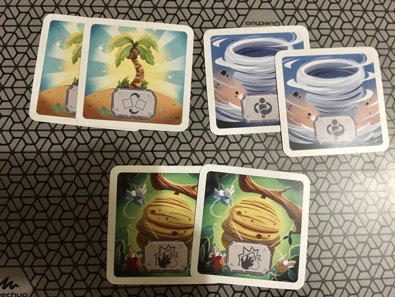 Есть карты ловушек. Открыв тайфун- все игроки одновременно должны повернуться вокруг своей оси. Открыв улей- все игроки должны хлопнуть по этой карте. Открыв пальму, нужно поменять местами пальму и открытую в тот же ход другую карту.