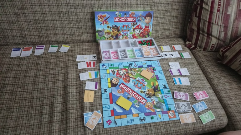Первой игрой стала монополия. Дочка называет её своей любимой игрой, играет она чаще с бабушкой, для которой монополия - это понятная игра из прошлого. Я её не очень люблю, хотя сама и купила одной из первых настольных игр и подарила дочке два года назад. Из своего детства помню всего три игры: шашки, звезда Африки и монополия. Когда мне было 7,старшая сестра моей подруги (ей было 11) научила нас играть в неё. Оригинальной игры у нас в детстве не было, мы её рисовали, вырезали деньги, поле, придумывали улицы. Цена на оригинал два года назад казалась мне не адекватной и я купила аналог. Из щенячьего патруля там только картинка в середине, а все улицы обычные, правила тоже классические. Мы обычно сразу договариваемся сколько по времени будем играть и только после этого начинаем. В этот день доигрывали партию которую начали накануне. Победила дружба, точнее дочка, хотя я даже не считала, но все дома на поле это её постройки .