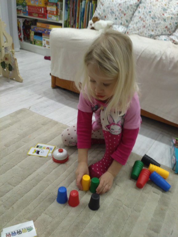 Скоростные колпачки из фикс прайса, Даша уже довольно хорошо собирает комбинации, но ещё играть на скорость рано. Ей нравится.