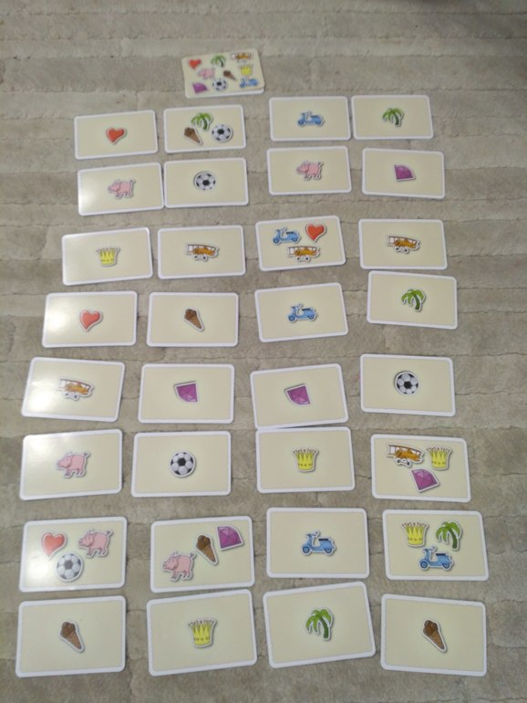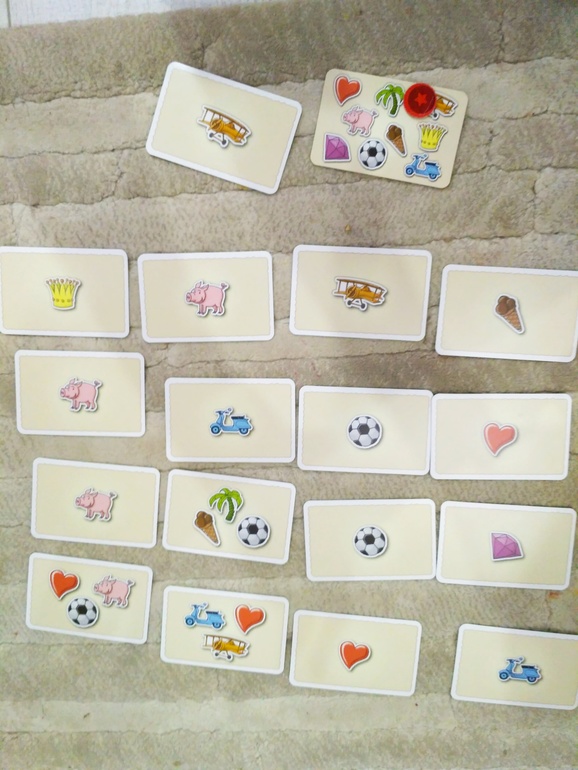 Вот например партия, сверху центральная карта с 9 предметами, под ней карта с загаданным предметом, на фото она рядом - самолёт.