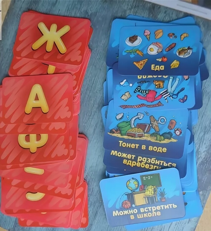 Вначале читается задание ( на синие карте) и открывается буква, на эту букву нужно и придумать слово. Например Еда на букву "ж" - желе, желток и т.д.