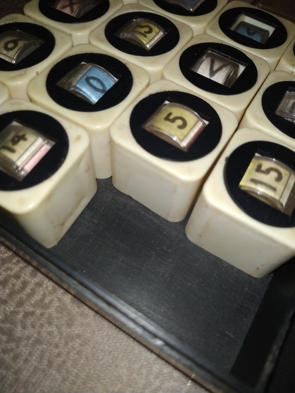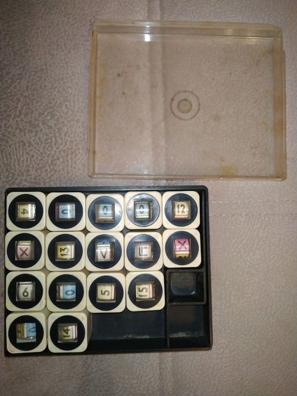 Это чудо советских игр- множество игр в одной! Очень любила в детстве. Если выставить числа на маленьких табло- будет игра "пятнашки", если выставить крестики и нолики- будут как раз они:) Еще было множество вариантов игр, уже не помню. Найти бы инструкцию-там все описано. Еще вот этот разделитель ставится по-разному, в зависимости от игры.