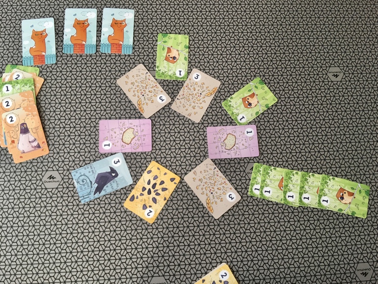 Но если Вы так сделаете, то я , добавив всего двух воробьев или одного голубя выиграю. Поэтому Вы решаете выпустить кошку. Кошкой Вы можете вспугнуть одну любую стайку, т.е. птицу или группу птиц между двумя картами кормушки. Вы решаете спугнуть одну ворону. Ворона уходит в сброс, а кошка выкладывается недалеко от кормушки. Сумма значений птиц стала равна 5.