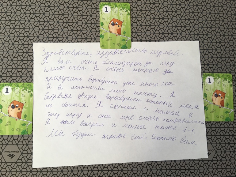 Сыграли с сыном пока две партии. Выиграли оба по одному разу. Игра рекомендована с 7 лет, думаю, рекомендация абсолютно верная, потому что расчёты, хоть и небольшие, вести придётся. Моему сыну 8 лет, ему играется отлично, всё понятно, он уже во второй партии понял тонкости. Рассуждал , что отправление голубя в кормушку, будет гарантировать мою победу в следующем ходе, поэтому он отправит кошку на охоту. Я млею от рисунков и играю с удовольствием.