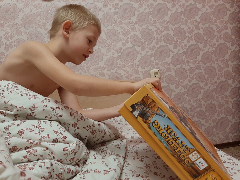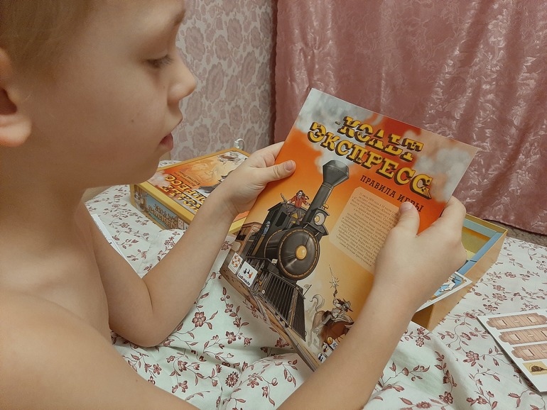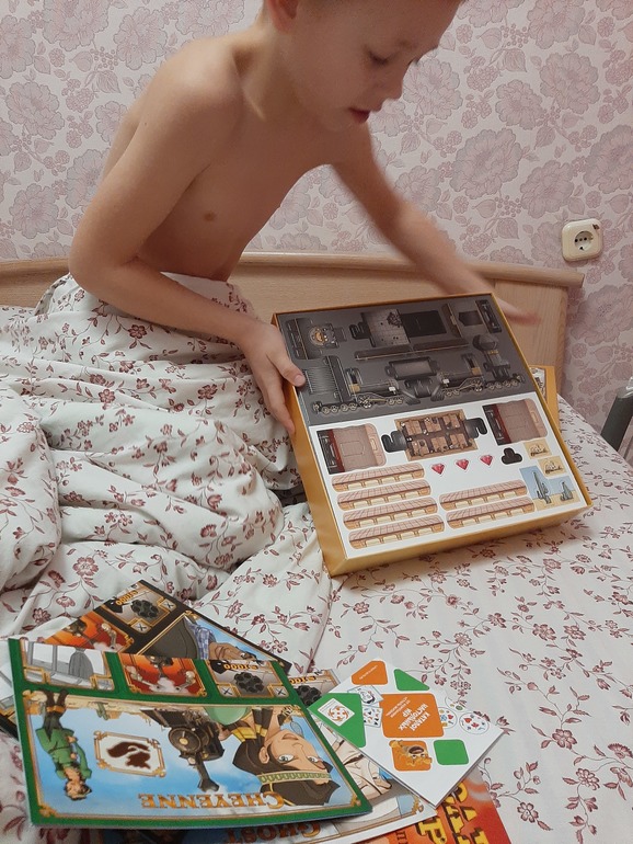 В первую очередь меня покорил антураж: вагончики, кактусы, стреляющие миплы. Я прям видела лихого бандита , несущегося на скакуне быстрее поезда, ловко раскручивающего лассо и запрыгивающего на крышу поезда. Ииихааа! Могу поклястся, я слыщала шелчок револьвера, и запах пороха, и жаркое слепящее солнце.. Ладно, что это я🤣Поиски игры показали, что не так-то много мест, где ее можно было купить. До Питера ждать ( целых 2 недели) силушки не было ( как же марафон?) . Посему пришлось снарядить экспедицию в Минск. Всего полтора часа езды и заветная коробка у меня. Но как, взять и вот просто сразу отдать ее сыну? Без повода? Хм, нет. Пришлось срочно придумать обучательно-выжидательный повод🤣 А именно подождать до завтра ( поздно вернулись) ,т.е. сегодня и прям с утра проходить квест по поиску игры. У нас это сугубо в рамках квартиры, сыну читать записки-подсказки намного интереснее, чем заниматься по букварю. Конечно, ему не терпелось и хотелось "нууу хоть посмотреть.." Но велено было пленку снять завтра! За такое издевательство он проснулся до 8 часов, взял ночник и пошел "квеститься") ну а потом...