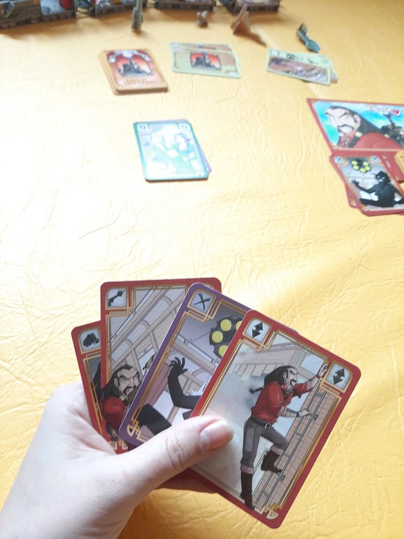 Хитрые "товарищи" двигают шерифа ко мне и в итоге я получаю шальные пули и спасаюсь бегством. Эх, а я планировала набить карманы потуже. В свой ход не обязательно разыгрывать карты с руки, можно вместо этого добрать еще 3 из своей колоды.