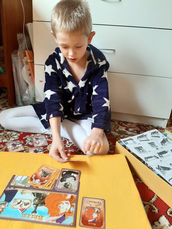 Вот, мне нужна была карта ограбление, ведь без этого ничего не украсть. К 4 раунду я уверенно лидировала, ведь у меня был сундук на 1000$ и по-мелочи всякое. Однако , мои хитрые"напарники" атаковали меня и я потеряла часть добычи.В итоге в первой партии выграл сын, т.к. получил 1000$ за наибольшее число расстреляных патрон, а во второй муж награбил больше всех.Я не отчаиваюсь, реванш еще впереди!