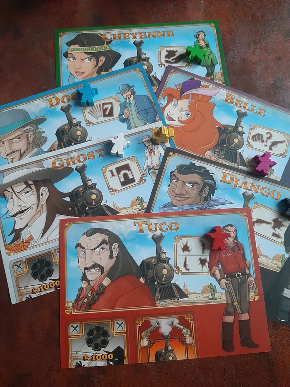 С трудом отпросившись чистить зубы, я успела сварить кашу) Так что всем пришлось пережить еще часок ожидания. Зато потом мы сыграли две партии сразу и остались очень довольны, включая даже мужа. В игру можно играть от 2 до 6 игроков. Каждый получает своего персонажа и его способность: стрелять сквозь крышу, украсть награбленное, увернуться от пуль и т.д.