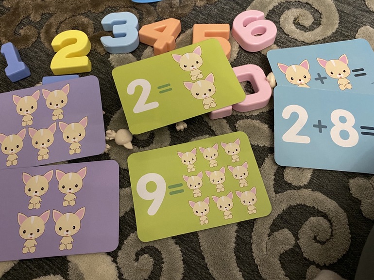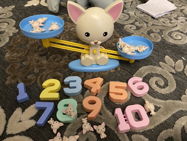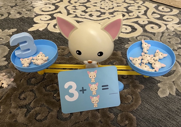 Первый, зелёные карточки - надо сопоставить количество нарисованных котиков и нарисованную цифру. Сделал верно - весы придут в равновесие.