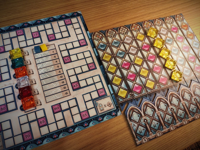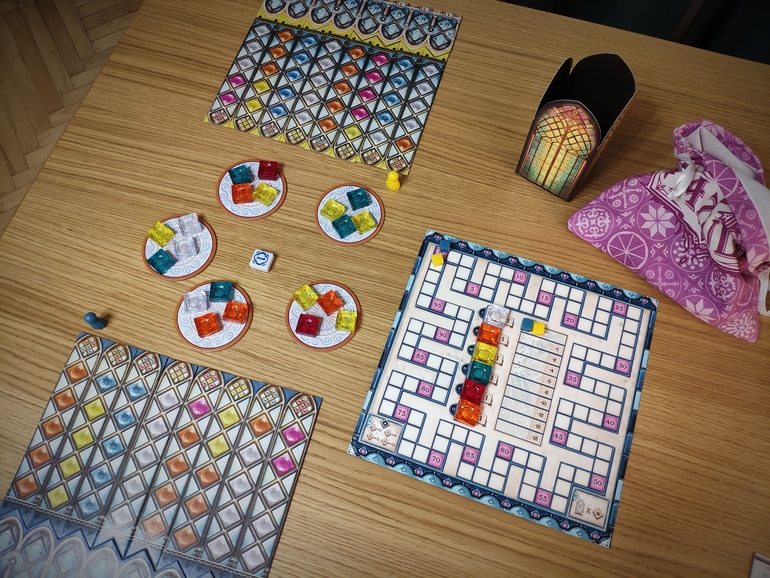 Так совпало, что получила я свой приз аккурат к приезду мамы, и всю неделю каждый вечер мы с удовольствием проводили за 2-3 партиями, медитативно заполняя свои витражи, стараясь не пакостить друг другу.