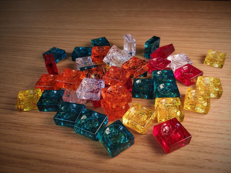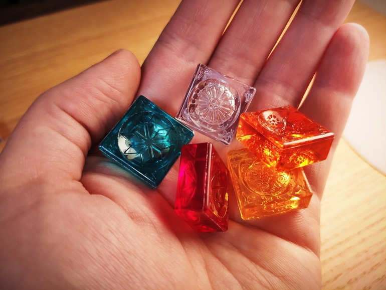 И так стёклышки!!! Мало того что они красивые (блестят как настоящие!) - так ещё и очень приятно их держать в руках, перебирать,раскладывать - собственно, что вы и будете делать всю игру, а значит получать от этого удовольствие на протяжении всей партии...