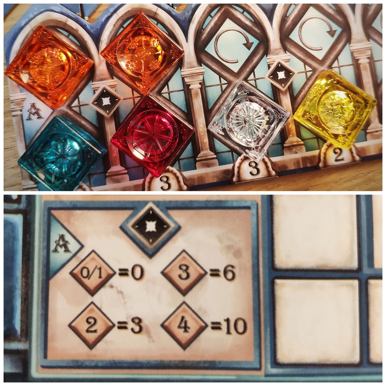 а так же каждое стёклышко закрытого ряда активного цвета в этом раунде (в данном случае игрок получает дополнительных 5 очков за пять жёлтых стекол, выставленных им в первом раунде),