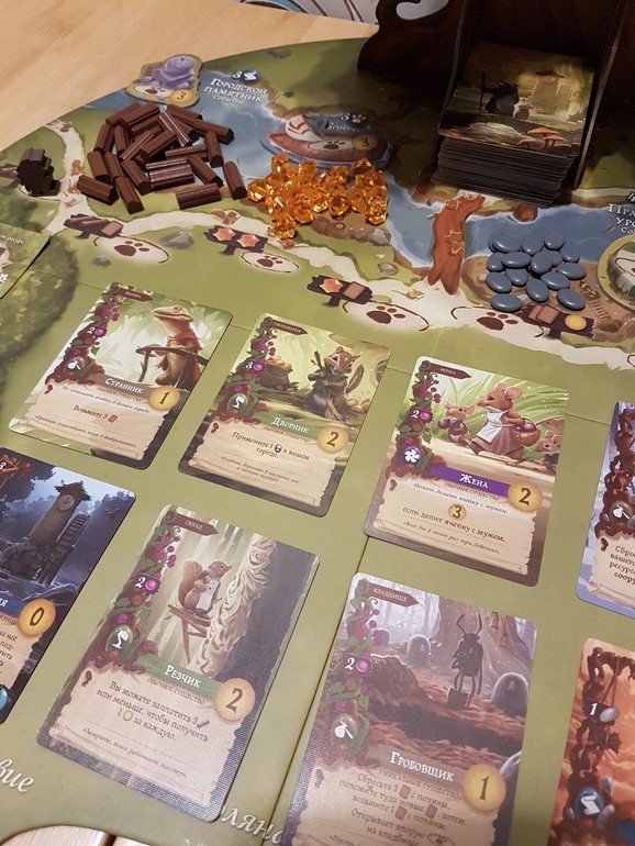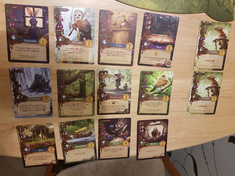 Миплы в виде милых зверушек. Рисовка карт просто обалденная, всё продумано до мелочей. Сооружения и существа идут парами. Так вот, если это Лавка, то в окне виднеется заяц, а если Лавочник, то это заяц, а за спиной окно. И так во всех парах. Правда не обошлось без накладок. Почему то в пару к Университету идёт Лекарь. Какая связь? Скорей всего в оригинале был Доктор, а наши скреативили да мимо😕. И карта Склад вызвала бурные обсуждения из-за некорректного описания. Ответ автора игры - игрок получает один вид ресурсов на выбор, а не все сразу, как пытаются объяснить хоббики.