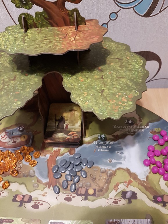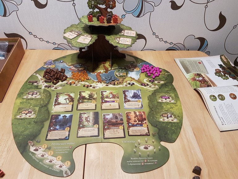 Много нареканий, что дерево бессмысленное, поле огромное, и всё это только мешает. Категорически не согласна. Мне как раз очень понравилось, что для всех компонентов предусмотрено место либо на поле, либо на ветках. В том же Покорении Марса проблема разложить карты так, чтобы не перепутать, где колода, где сброс, а где свои карты. В Эверделле этой проблемы нет, всё всегда на своих местах.