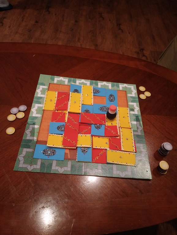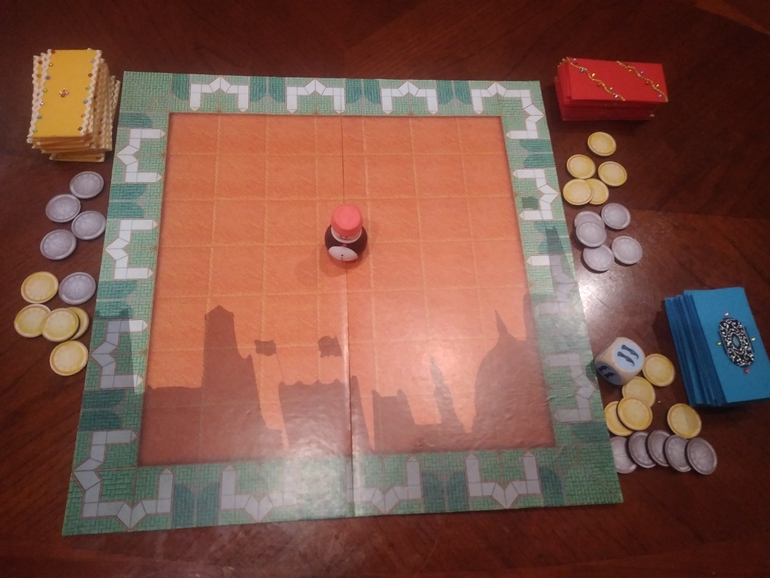 семейные игрыЗахотелось показать мой вариант известной многим Марракеш в рамках флешмоба " открываем новые игры". Увидев несколько обзоров загорелась приобрести игру , но ценник посчитала совершенно не гуманным и решено было сделать игру самой . Нашла на всем известном сайте пнп , размер поля оказался меньше оригинала и соответственно ковры меньше , а мне хотелось бы ближе к оригиналу и что бы мелковато не было . Спасибо Светлане Photine она мне подсказала размер оригинального поля . Распечатала на самоклейке и на картон . В этой игре у меня дебют складного поля , на духстороннем скотче наклеено на пластичную замшу ,вроде бы получилось ничего . Как будет по изностойкости посмотрим в процессе ). Ковры- фетр , стразы самоклеящиеся с Али , остальное часть на клее моменте , часть на двухсторонние скотче. Процесс изготовления всей игры прост . Монеты - диски для суставов игрушек из Леонардо , они есть из фанеры , есть из ДВП . Из ДВП пахнут копчёным , очень ребенку нравиться , и с двух сторон самоклейка . Надоело мучаться с вырезанием круглых тайлов и случайно наткнулась на эти диски , они есть разных размеров. Самое сложное для меня было в изготовлении - расписывать Асама , не даются мне ровные линии (. Правила тоже крайне просты , останавливаться подробно на них не буду . Главное в конце игры , что бы у тебя было больше денег , чем у других и как можно больше твоих ковров не было закрыто чужими. Деньги получаешь когда Асам в процессе чужого хода останавливается на твоём ковре . Игру сделала совсем недавно и партий было сыграно немного , но мне и ребенку понравилась игра , лёгкая , приятная тактильно , монетки даже позвякивают когда бросаешь на стол ), есть элемент тактики , который волне подвластен уже детям с 6-7 летнего возраста - повернуть Асама в нужном направлении когда делаешь ход . Для детей + освоение счета , монеты 5 и 1 дирхам , денег всегда платишь разное количество , ещё и сдачу приходиться давать .
