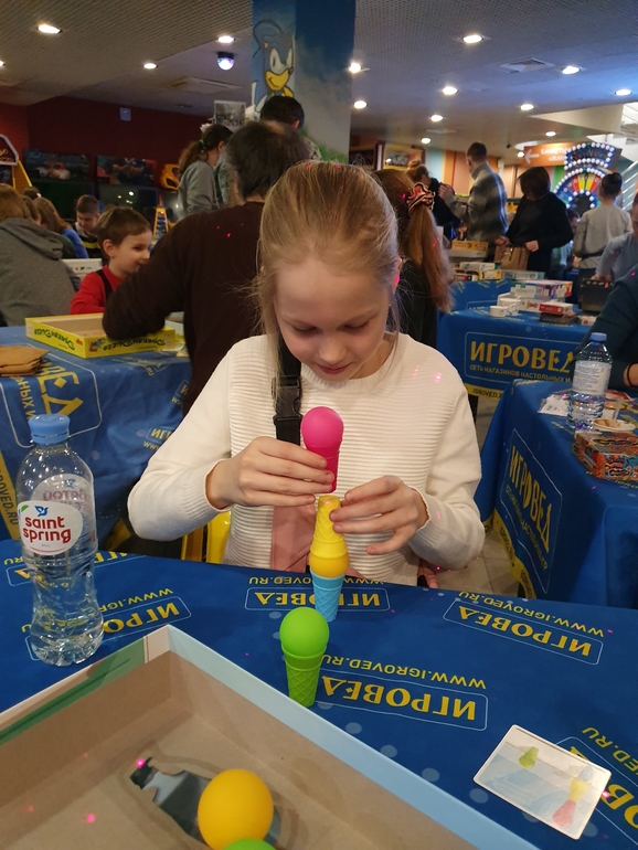 Мороженое - тактильный восторг от шариков и вовлеченность в процесс 100%. Вот что может быть проще? Ну разве что столы если бы были устойчивые. А тут одна стол ногой пошатнёт, все валится, надо ловить шарики, а руками трогать нельзя. Забавно, некое усложнение от Игроведа для тех, кто по факту игру перерос :) Дочь попросила подарить брату такую игру, но я лучше подарю племяннику, когда он чуть подрастет, чтобы мои могли побаловаться у родственников :)