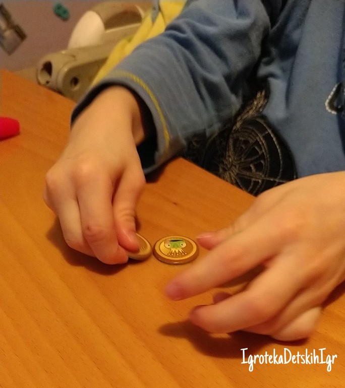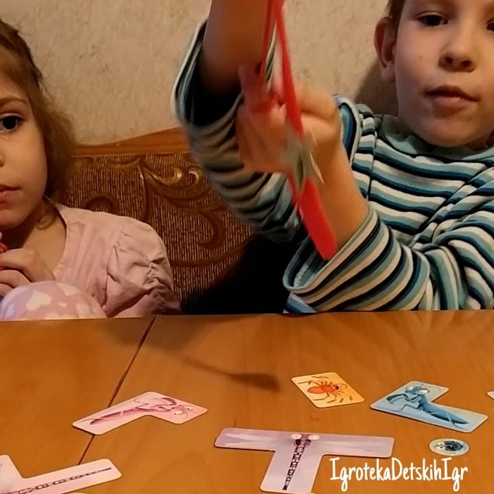 Кидаем кубики, определяем тип и цвет насекомого и ловим его всем скопом. Кто поймал, тот и получил жетон хамелеона. Кто набрал 5 хамелеончиков, тот и выигрывает. Если же игрок зацепит нечаянно и осу, то жетончик он не получит.