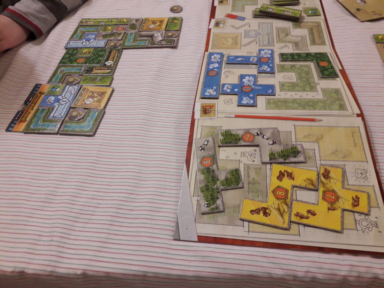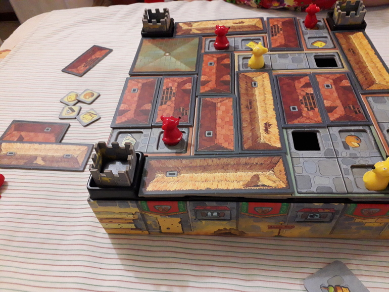 Потом мы разложили "Сырный замок"...одна из самых долгоиграющихся игр в нашей коллекции. Я к ней испытываю крайне нежные чувства. Вспоминаю, как Саня в свои три с половиной сам выбирал игру "про мысей". Тоже шли ровно, по три сыра на рыло (извините, мышиную морду), а потом Саня подпихнул нужный тайл сыра под своего мышонка, свалив заодно в темницу моего. Итог: 4 сыра набраны.