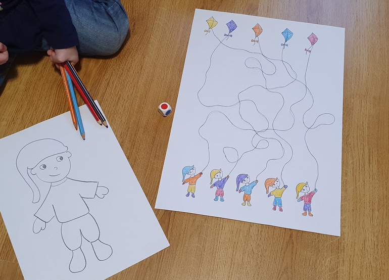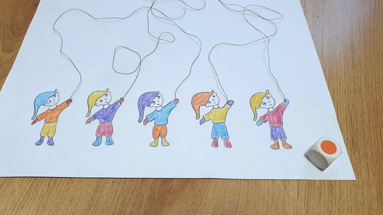 Играем так. Перед началом каждый игрок получает раскраску с гномиком. По очереди бросаем кубик и ищем гномика, который держит змея того цвета, который выпал на кубике. Ниточки трогать нельзя, только прослеживать траекторию глазами.