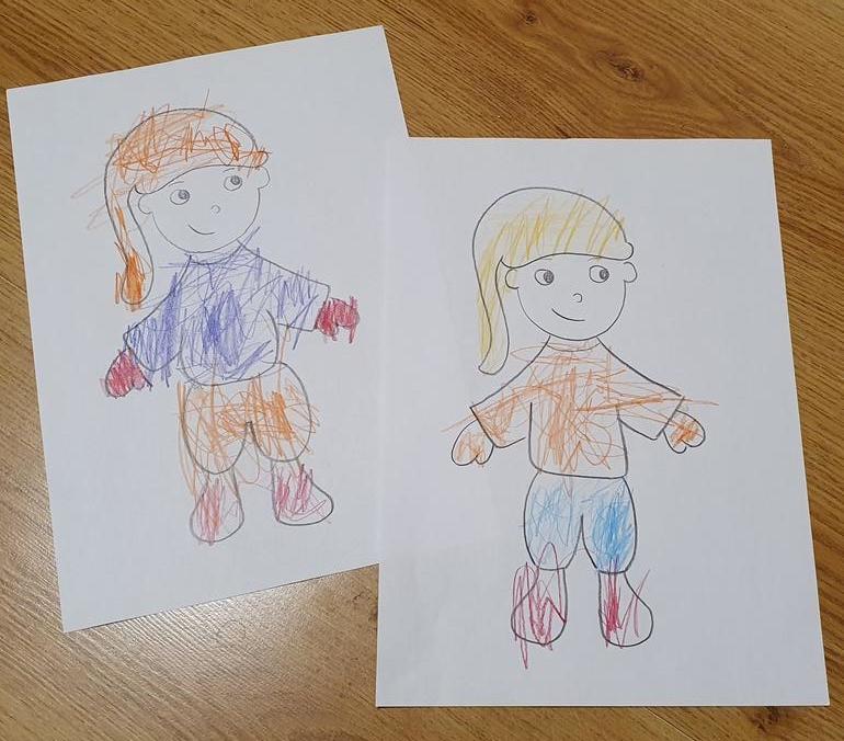 Например, на кубике выпал красный цвет, смотрим по ниточке, красного воздушного змея держит второй слева гномик. У него жёлтый колпачок, поэтому раскрашиваем у своего гнома колпак в жёлтый цвет. В следующий ход раскрашиваем кофточку, потом штанишки и т.д. Победителей у нас традиционно нет (дочке три года, ей пока важнее процесс). Очень нравится в конце сравнивать гномиков.