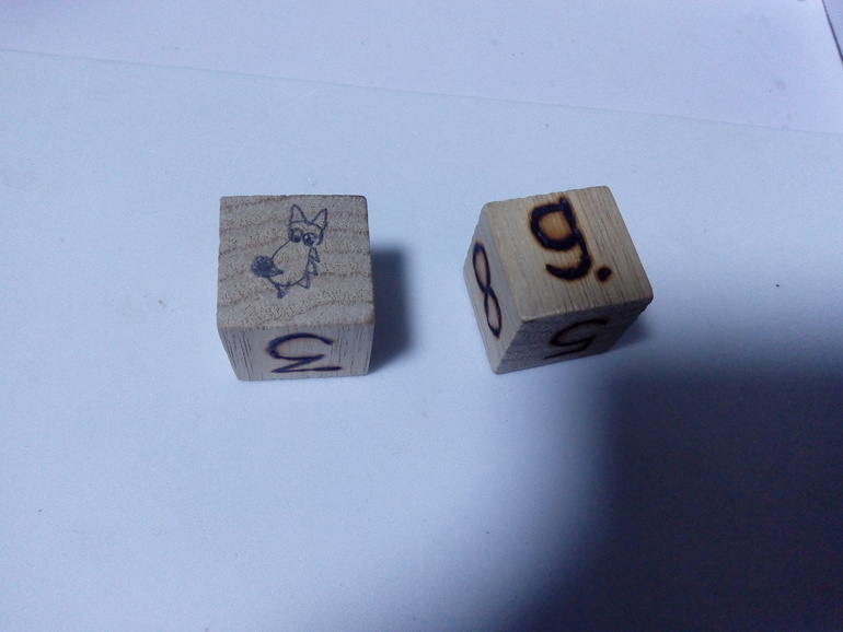 Но это не всё. Дальше я сделала кубики. Совсем недавно в сообществе обсуждали игру на состав числа. Вот я кубики такие и сделала, на одном цифры от 1 до 5, на другом от 6 до 9 плюс волк.