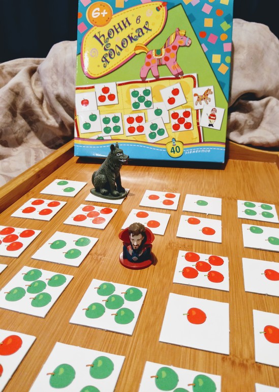 Кони в яблоках. Дополнила игру миниатюрами собаки и садовника (спасибо, сообщницы, за идею), в целях сбалансированности оставила жетоны номиналом, как в оригинале (в этой игре их немного больше) и получился ооочень крутой математический тренажёр! У сына, конечно, любимый момент сделать хитрющий вид, произнести "ну как же мне тебе насолить…" и переставить собаку. Он почти каждый ход так говорит))))))) а если серьезно, играем не так уж и часто, а прогресс за пару месяцев на лицо.