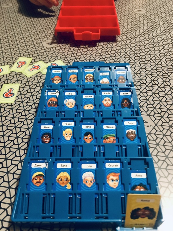 Тоже , своего рода, игра на скорость. Как же нравится детям! Тоже одна из самых стареньких наших коробок, уж вся потертая, заклеенная. Если начинаем играть, то остановить детей просто невозможно. Дочка так всегда просит продолжать ещё и ещё, что отказать просто невозможно. Сегодня сыграли 6 партий, но меня умоляли ещё продолжать. Благо было уже за полночь, повод отказать вполне веский. Нахохотались! Дочка такая задорная всегда в этой игре, смешная, шутит, смеётся. Мы ещё сегодня ввели новый тип вопросов. Например: «В твоём имени больше четырёх букв?» , «Твоё имя начинается на согласную букву?» или «В твоём имени есть буква А?». Дочка подхватила эту идею и использовали её по полной, очень ей понравилось.