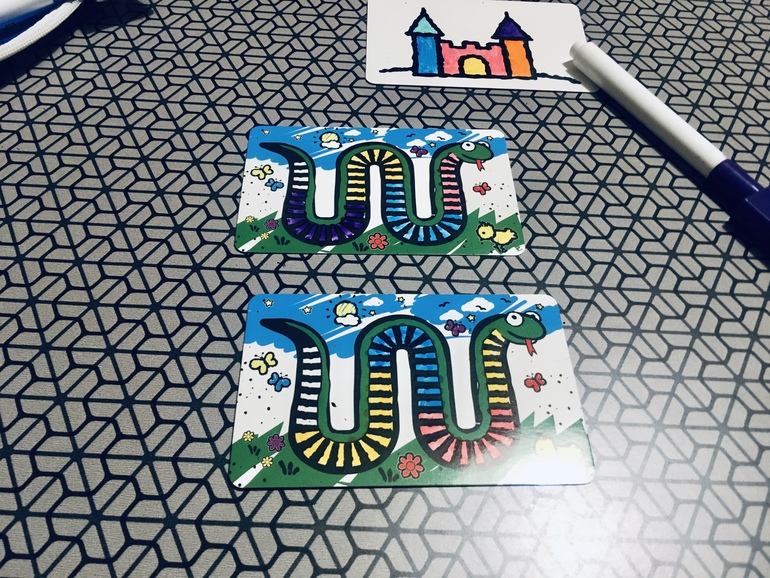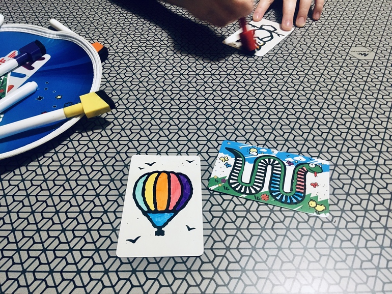 Каждый раз, как достаём эту игру, я вспоминаю мою сестру , летние каникулы, наш укромный уголок в зарослях винограда на даче. Мы стелили одеяла и днём прятались там от солнца. Рисовали, играли, делились секретами. Вот бы нам тогда эту игру. Мы обождали раскрашивать. Как бы мы играли! С дочкой же сегодня сыграли три партии по четыре раунда.