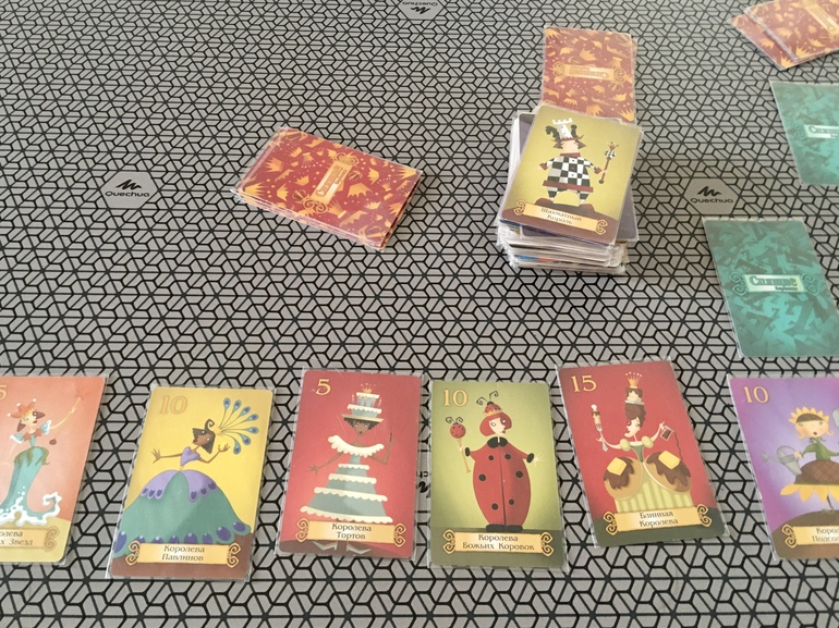 Выбрал сын. Одна из самых заигранных наших коробок. Если бы карты были не в протекторах, боюсь даже представить, во что превратились бы за эти годы. Раньше втроём играли до 5 королев, а в последнее время больше нравится играть до 50 очков, тогда при похищении, чаще всего, учитываются не личные симпатии, а самая дорогая королева. Играть с такими условиями стало намного интереснее. Королева сердец стала самой вожделенно картой. Ведь , имея её, можно порой даже с стремя картами победить. Сыграли три партии подряд, каждый выиграл по разу. Дочке больше всего нравится королева кошек, победа без этой персоны, для неё не так радостна. Даже имея перед собой королеву собак, дочка , и глазом не моргнув, похищает у нас кошачью повелительницу, а ведь это вынуждает сбросить королеву собак. В этой игре дочка расстраивается , если к концу парти её любимица так и не досталась ей.