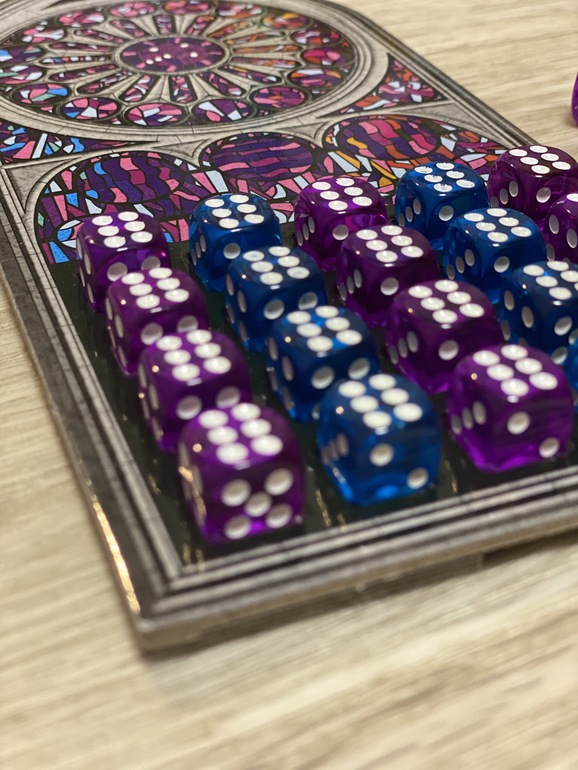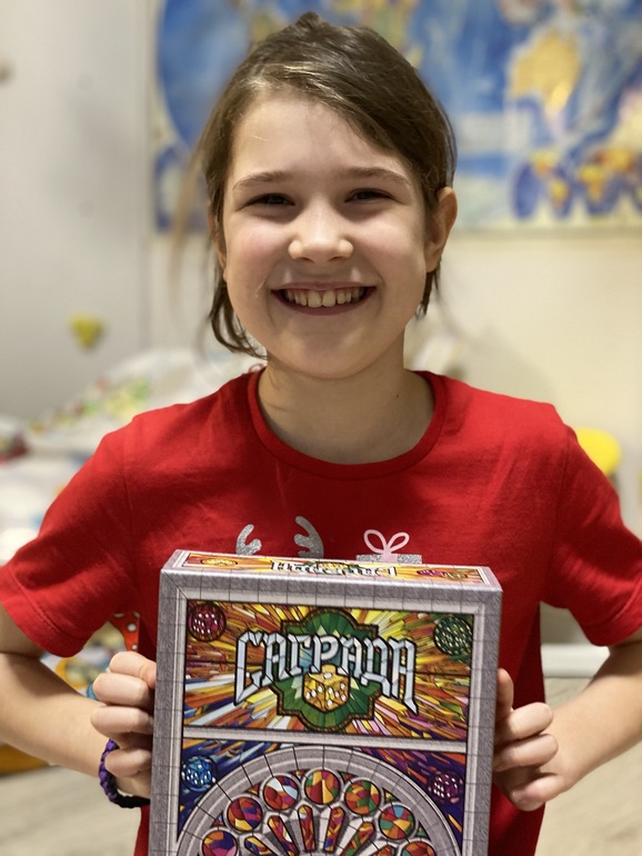 Вечером мы на троих - я, муж и младшая, разложили Саграду. Это пока единственный абстракт в коллекции, смотрю на Азул, но цена не радует). Саграду купила недавно с рук в пленке за приятную цену. Очень привлекли кубики, а так как у меня компания девчачья, то разноцветные кубики не могли им не понравиться. Муж в принципе тоже всегда играет, если предложить, но пока не выигрывал, что его немного раздражает). Мы с детьми играли в неё много, они меня через раз побеждали, в общем мы с ними уже такие игроки с опытом. А муж играл второй или третий раз. Я собирала много кубиков своего цвета и за счёт этого обошла всех и победила. Муж же пытался заработать на общих целях, но после окончания игры сделал вывод, что можно вообще не делать ничего, а только собирать кубики своего цвета. Не знаю на сколько он прав, но я и правда побеждаю тогда, когда выполняю личную цель, а не общую. Даже не заполненные квадраты в конце игры не сильно влияют на результат, если у тебя все хорошо с личной целью. По итогу муж на втором месте с разницей около семи очков со мной, и на последнем месте дочь с разницей четыре очка с мужем.