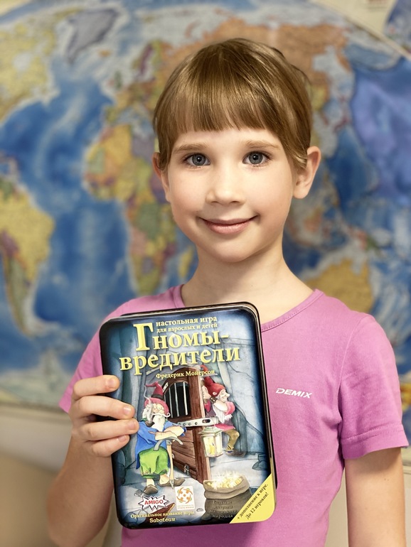 Потом достали гномов-вредителей. Тут к нам присоединилась и наша старшая. Играли с дополнением, что кардинально меняет всю игру. Например, в последнем раунде гномов вредителей у нас не было ни одного, но у каждого были свои цели и каждый старался выполнить их, получалось, что все друг другу мешали. Поэтому почти про каждого можно было сказать, что он вредитель. В первом раунде до золота дошли всего два синих гнома и получили по четыре монетки. Во втором раунде все и зелёные и синие гномы пришли, получили по три монеты. А в последнем раунде дошли до золота все шесть игроков и получили всего по одной монете. Выиграли те, кто схватил золото в первом раунде). Ими оказались наша подруга и младшая дочь. Хотя они со старшей были наравне, но младшая использовала вора и забрала одну монету, чем обеспечила себе победу.