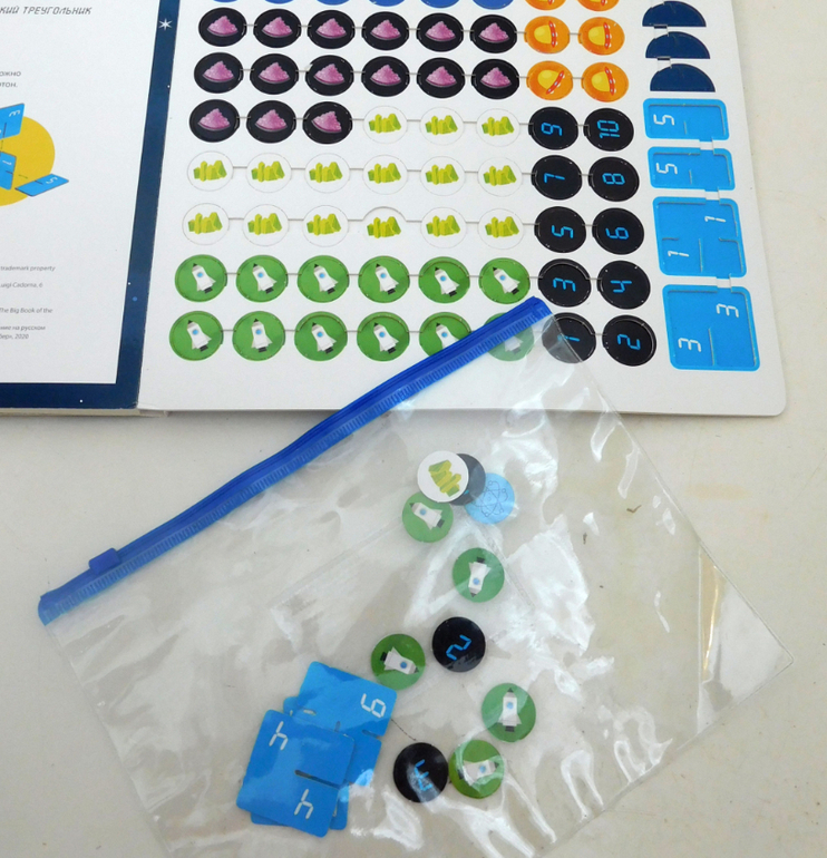 Хранятся фишки в специальных "гнёздах". Удобно вынуть, легко убрать. Пока игра новая, фишки на своих местах сидят крепко. Но я подозреваю, что после активного использования книги фишки из гнёзд начнут вылетать. Поэтому для нашего комплекта я уже взяла пластиковый конверт - буду складывать фишки в него.