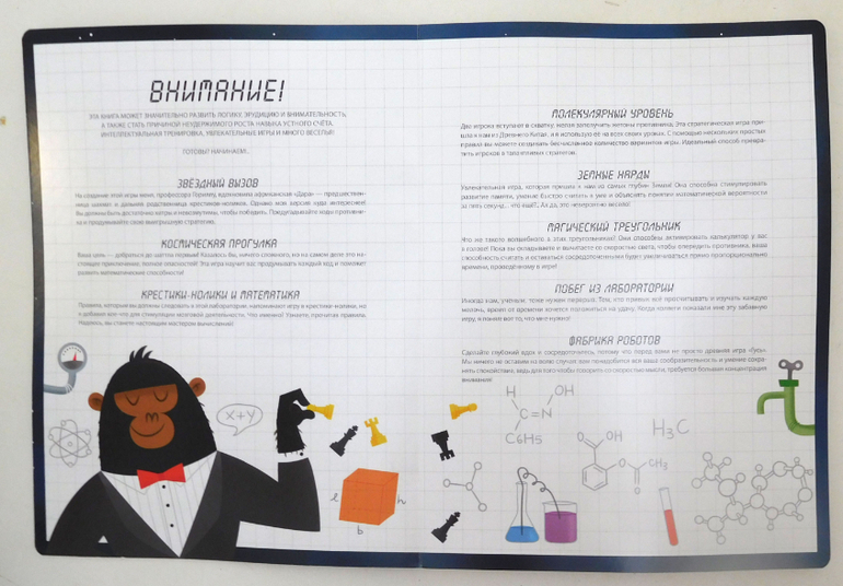Под крепкой обложкой скрываются 8 разворотов с настольными играми - т.е. размер каждой игры 54х36 см. Форзацы книги тоже используются - на первом мы найдёт краткое описание всех игр, на последнем - фишки и жетоны.