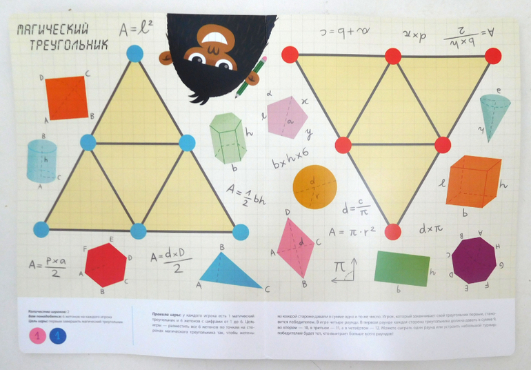 Особенно мне понравилась игра "Магический треугольник". Ребёнок должен так расположить жетоны с числами, чтобы сумма жетонов на каждой стороне была равна между собой. Я видела много "магических квадратов", но вот "магический треугольник" встретился мне впервые. Вдвоем в эту игру играют на скорость. Но в нее можно поиграть и одному - потренироваться, развивая навык счёта.