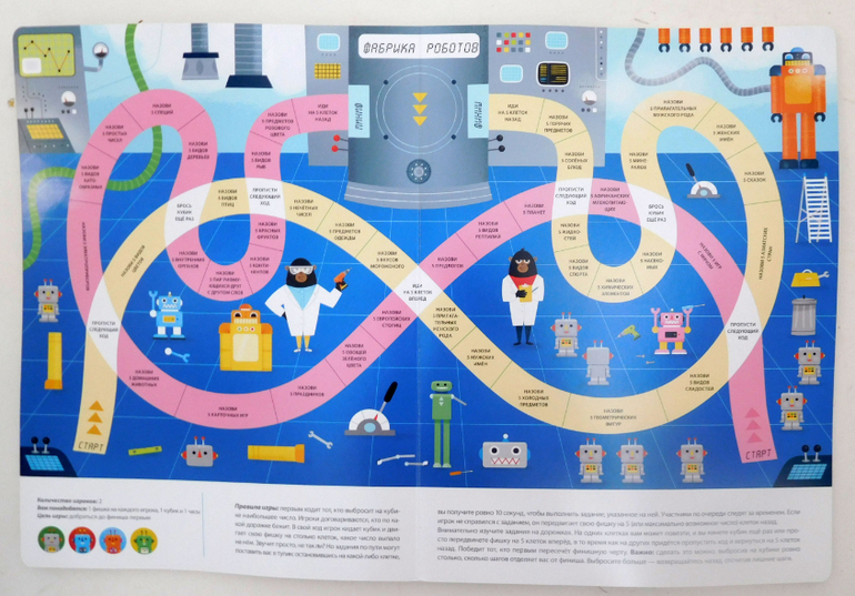 Занимательной мне показалась и последняя игра - "Фабрика роботов". Игрок, заняв клетку, должен назвать пять... А вот чего пять - это уж как повезёт: то ли пять сладостей, то ли пять видов спорта или пять химических элементов или пять рифмующихся слов или еще чего ... Вопросов много. Уложился в 10 секунд, справился с заданием - остаёшься на клетке. Не успел - вернулся назад.