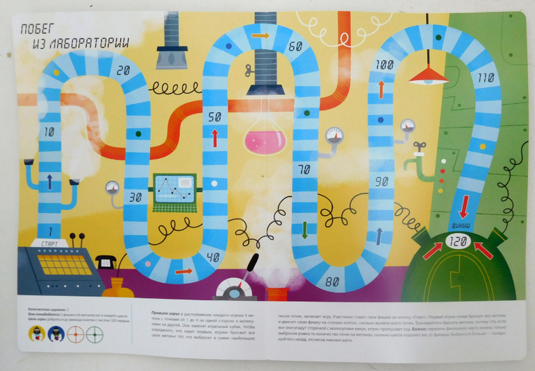 Все игры оформлены единообразно: основную часть разворота занимает игровое поле, под которым указаны возможное количество игроков, перечень фишек, цель игры и подробные правила.