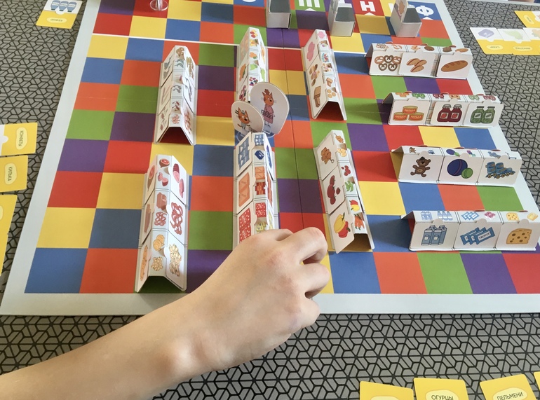 Дети предварительно отложили несколько коробок для их компании. Так вот на магазин наш гость сразу обратил внимание и захотел поиграть. Ему понравилось. Мультфильм про трёх котов оказался ему знаком , поэтому ответы на все вопросы по поводу персонажей игры дети мои получили. Вроде ходилка, но так здорово придумали с цветным кубиком и клетками. С детьми уже много партий мы наиграли, но они у меня так аккуратно бросают всегда кубики, что никаких неудобств мы не испытывали. А наш гость чуть ли не танцы с бубном устраивает перед броском: и дует, и машет, и что-то там шепчет в надежде на верный бросок, а потом кааак кинет кубики... и все продукты с полок слетают. Мы начинаем складывать их обратно на прилавки, а через три хода опять тоже самое. Стол , за которым играем , маленький, не предназначен для такого размаха. Зато так здорово наблюдать за человеком, который отдаётся процессу абсолютно полностью и переживает за каждый свой ход. Очень уж мальчик хотел выиграть и у него получилось. Мы с детьми были очень рады именно такому финалу.