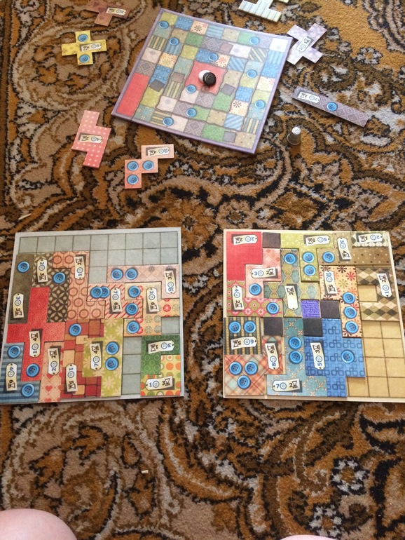 Еще из достижений выходных, дочка, наконец-то сыграла со мной в пэчворк. Сколько раз не пытались до этого, ей все время посреди игры скучно становилось, разве, что не засыпала. А мне-то она очень нравится! Игра даже поселилась зимой у бабушки, чтобы мы ее иногда с племянницей разложили. Но вот звездный час игры пробил и мы с азартом сыграли пару партий.