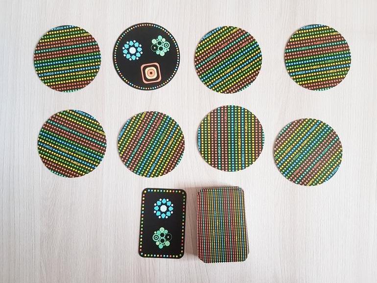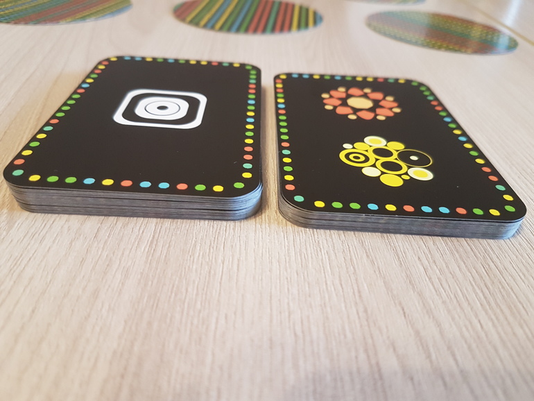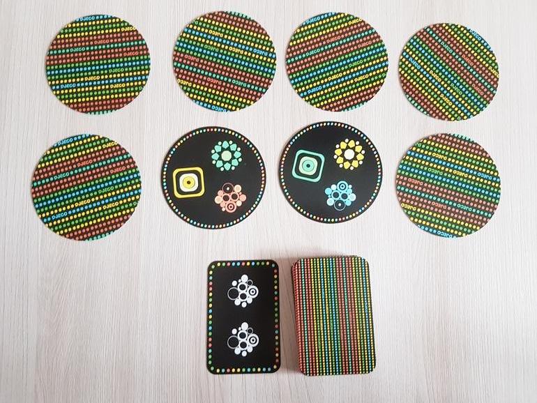 или несколько (от 1 до 3) фигур любого цвета (на фото - 2 белые фигуры, значит нужно найти на круглых картах две такие же любого цвета).