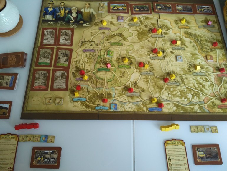 Сегодня вечером играли с мужем, сначала он был не доволен, не любит вникать в правила, много нюансов, но потом сказал что хорошая игра!! Ура!! Игра действительно хорошая, сложнее Билета, больше ньансов нужно учитывать, маршруты сам себе строишь а не идёшь по готовым. Нужно думать где выгоднее открывать отделения, что бы заработать дополнительные очки, в каких городах и областях лучше прокладывать маршрут.