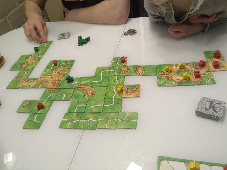 Напоследок достали забытый Каркассон, разложили партию, Аня с папой постоянно конкурировали друг с другом: