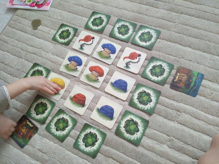 Вчера и сегодня играли с девчонками ещё в одну нашу новинку Миссия орехи, усложненое мемори, белки должны по дорожке из 3х карт дойти к ореху, сложность в том, что нужно назвать предмет или цвет на другой стороне карточке и не зависимо от результата ее перевернуть.