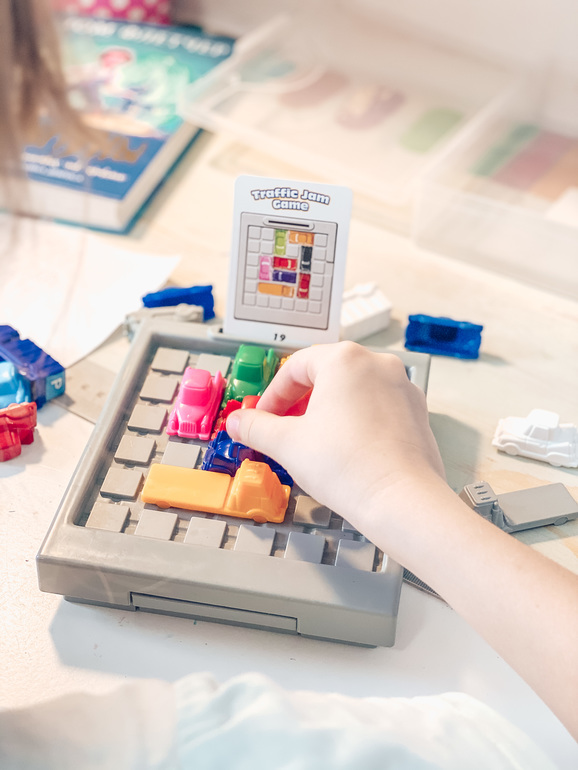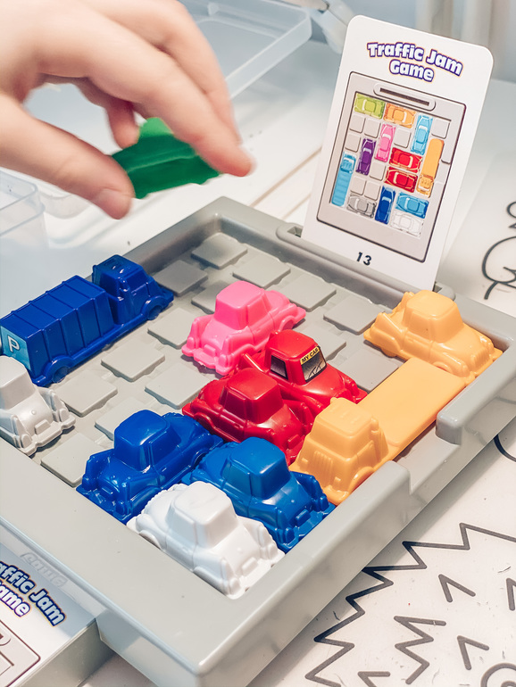 Старшая дочь остановилась на головоломке «Час пик». У нас не оригинальная версия, брала ее давным давно в майшопе за какую-то смешную цену, цвета машин не совсем совпадают с карточками, но не критично. Например, голубой на карточке это синие машины. Дети меня раньше спрашивали, если им было не понятно какую машину поставить на определённое место, но я им объяснила, что цвет тут роли не играет, главное размер. Смотреть, чтобы машина занимала столько клеточек, сколько в задании, а по цветам можно ставить как угодно. После этого про раскладку они перестали спрашивать.