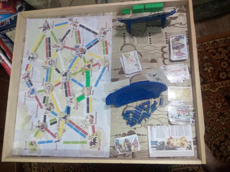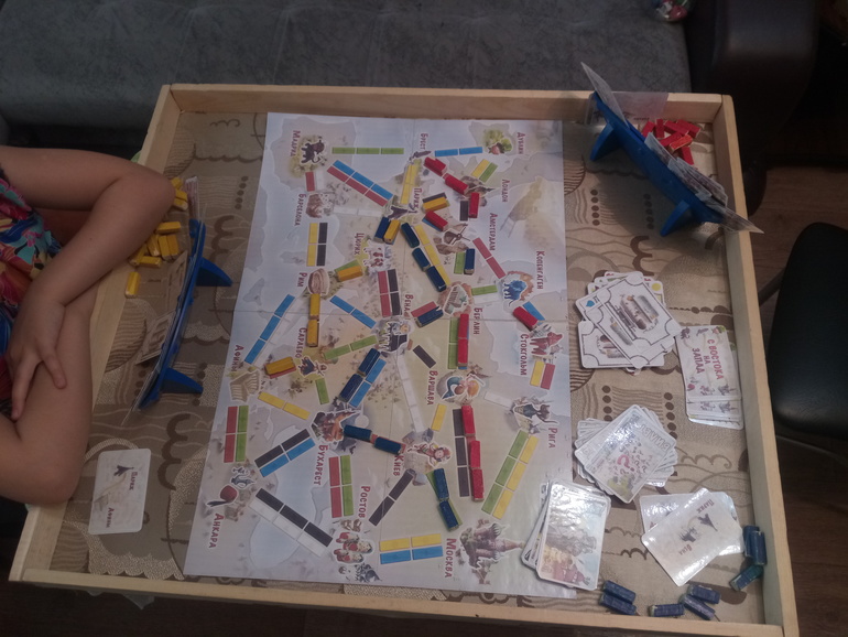 Показал и научил детскому билету на поезд. Взрослый где-то едет и едет и едет и никак не приедет (да, Ира?). Игра понравилась. Позже днем к нам присоединилась и дочка. Так гораздо сложнее и интереснее.