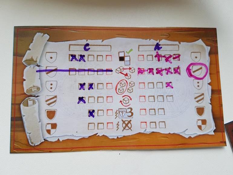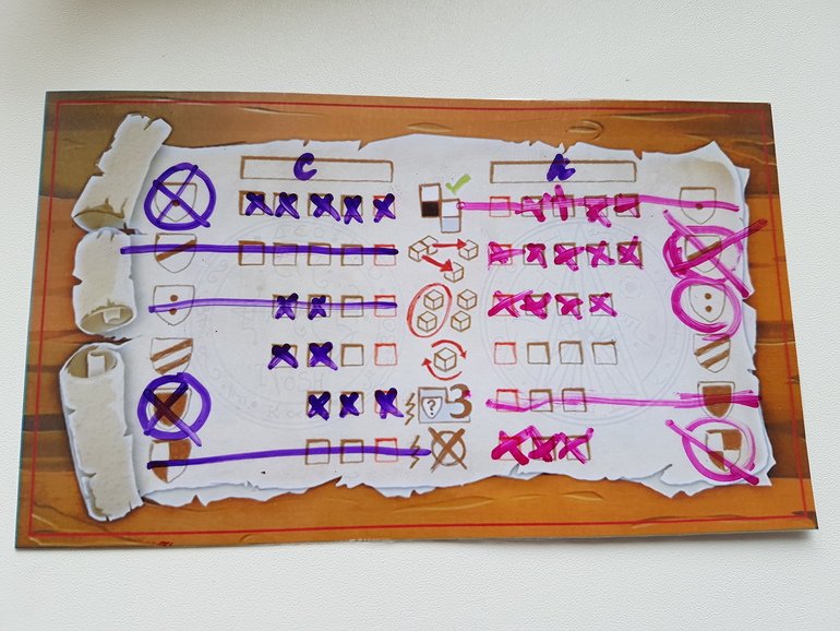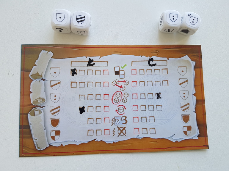 Такая система получения бонусов добавляет ценности кубикам без крестов, т.к.хочется получить полезные возможности самому и не отдать их сопернику. Теперь каждый раз при выборе кубика мы смотрим не только на герб и наличие/отсутствие креста, чтобы выгодно пристроить их в домены, но и на то, что мы сможем отметить в книге заклинаний, и не достанется ли вдруг сопернику желанный бонус.
