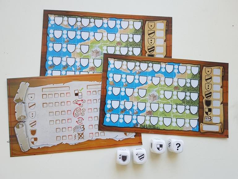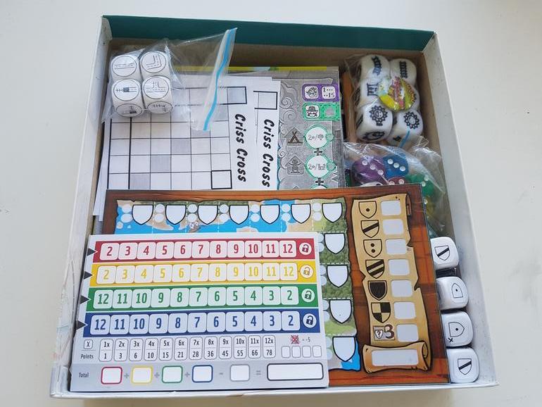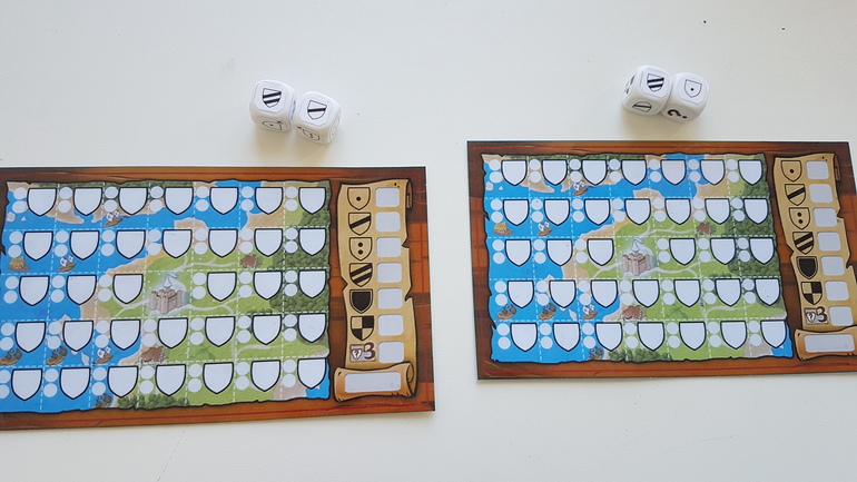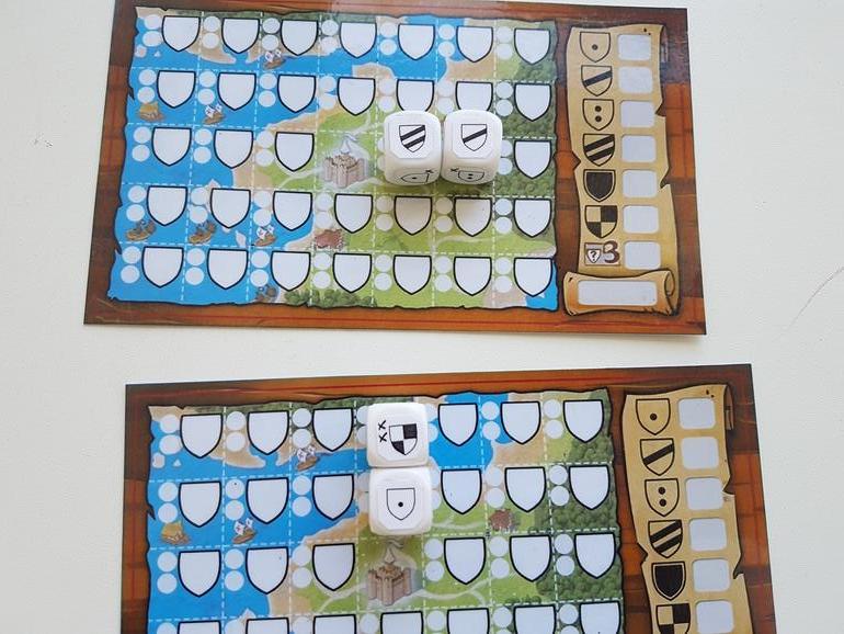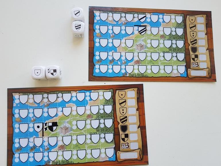 Таким образом формируются домены - территории с одинаковыми гербами. На некоторых гранях кубиков есть кресты, это то же самое, что короны в ЛК. И очки в конце игры считаются также, как в ЛК - умножаем количество гербов в домене на количество крестиков (они отмечаются возле герба).
