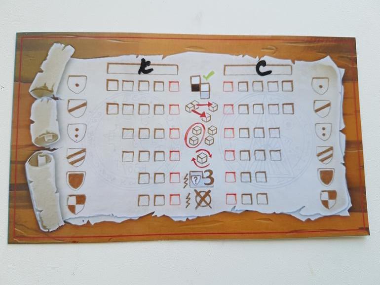 Каждый раз, когда игрок выбирает себе герб без крестика (знак вопроса не считается), он зачеркивает один квадрат на своей странице книги заклинаний напротив соответствующего герба.