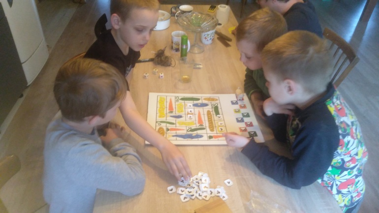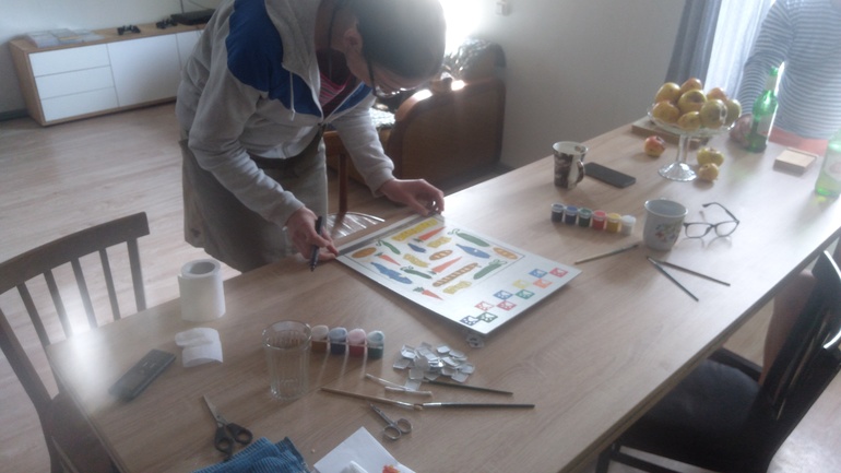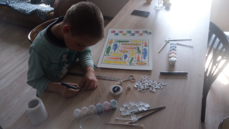 Поле сделали одностороннее, просто играем сразу по сложной версии правил. Материалы: белая доска от остатков ремонта, гуашь из фикспрайса, человек с руками из плечей, способный нарисовать морковь (фото с телефона, не судите строго):